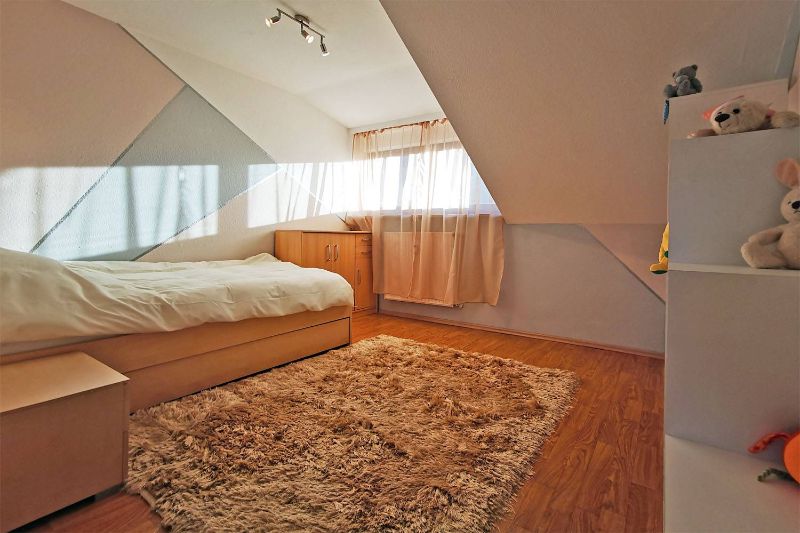 Das Badezimmer beinhaltet eine Badewanne, eine separate Dusche, ein Waschbecken mit Spiegel und eine Waschmaschine, sowie Toilette. Im Flur gibt es die Möglichkeit Kleidung aufzuhängen, sowie einen Abstellraum im Küchenbereich.
